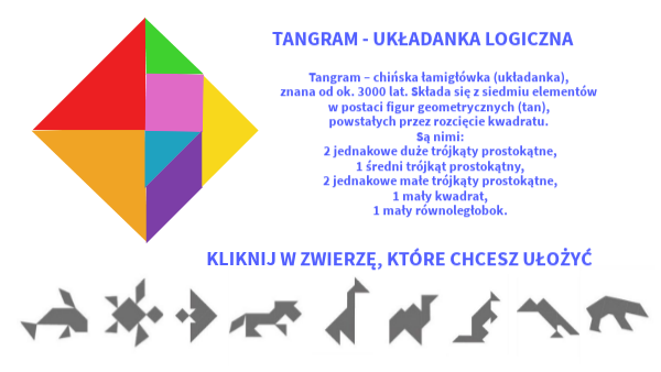 Tangram – chińska łamigłówka (układanka), znana od ok. 3000 lat. Składa się z siedmiu elementów w postaci figur geometrycznych (tan), powstałych przez rozcięcie kwadratu. Są nimi: 2 jednakowe duże trójkąty prostokątne, 1 średni trójkąt prostokątny, 2 jednakowe małe trójkąty prostokątne, 1 mały kwadrat, 1 mały równoległobok.
