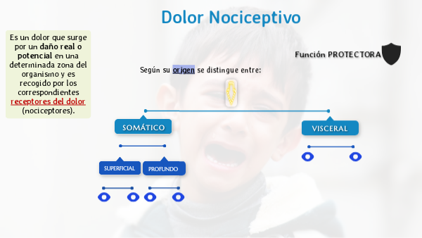 Es un dolor que surge por un daño real o potencial en una determinada zona del organismo y es recogido por los correspondientes receptores del dolor (nociceptores).