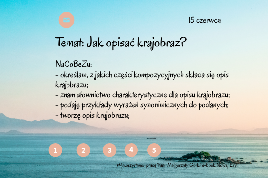 NaCoBeZu: - określam, z jakich części kompozycyjnych składa się opis krajobrazu; - znam słownictwo charakterystyczne dla opisu krajobrazu; - podaję przykłady wyrażeń synonimicznych do podanych; - tworzę opis krajobrazu;