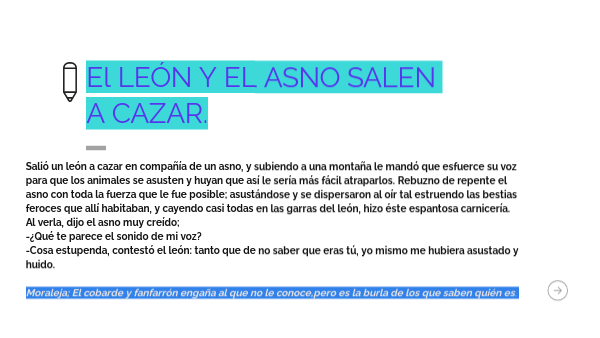 Salió un león a cazar en compañía de un asno, y subiendo a una montaña le mandó que esfuerce su voz para que los animales se asusten y huyan que así le sería más fácil atraparlos. Rebuzno de repente el asno con toda la fuerza que le fue posible; asustándose y se dispersaron al oír tal estruendo las bestias feroces que allí habitaban, y cayendo casi todas en las garras del león, hizo éste espantosa carnicería. Al verla, dijo el asno muy creído; -¿Qué te parece el sonido de mi voz? -Cosa estupenda, contestó el león: tanto que de no saber que eras tú, yo mismo me hubiera asustado y huido. Moraleja; El cobarde y fanfarrón engaña al que no le conoce,pero es la burla de los que saben quién es.