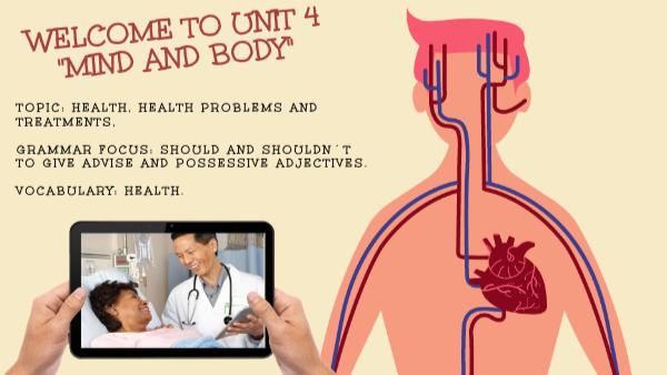 tOPIC: HEALTH, HEALTH PROBLEMS AND TREATMENTS, gRAMMAR fOCUS: sHOULD AND SHOULDN´T to give ADVISE AND POSSESSIVE ADJECTIVES. VOCABULARY: HEALTH.