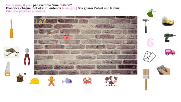 Sur le mur, il y a : par exemple "une maison". Prononce chaque mot et si tu entends le son [m] fais glisser l'objet sur le mur. Fais une photo et envoie-la.