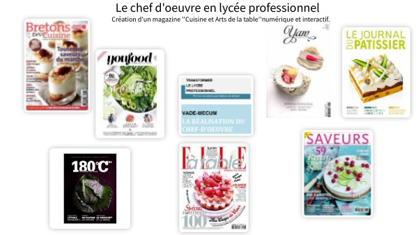 Le thème choisi pour le chef d'oeuvre est la création d'un magazine ''Cuisine et Arts de la table'' . Ce magazine est numérique et interactif. Vous le présenterez sur Génially. Un accompagnement est prévu par les professeurs documentalistes du lycée sur les questions de droits d'auteur, d'utilisation de contenus et de protection des données. Des visites dans des rédactions de journaux et magazines spécialisés en cuisine seront également programmés.