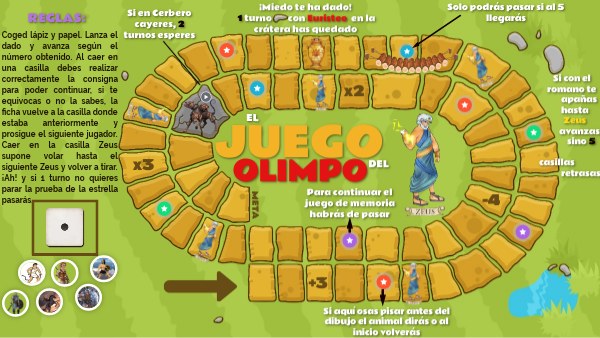 Coged lápiz y papel. Lanza el dado y avanza según el número obtenido. Al caer en una casilla debes realizar correctamente la consigna para poder continuar, si te equivocas o no la sabes, la ficha vuelve a la casilla donde estaba anteriormente y prosigue el siguiente jugador. Caer en la casilla Zeus supone volar hasta el siguiente Zeus y volver a tirar. ¡Ah! y si 1 turno no quieres parar la prueba de la estrella pasarás.