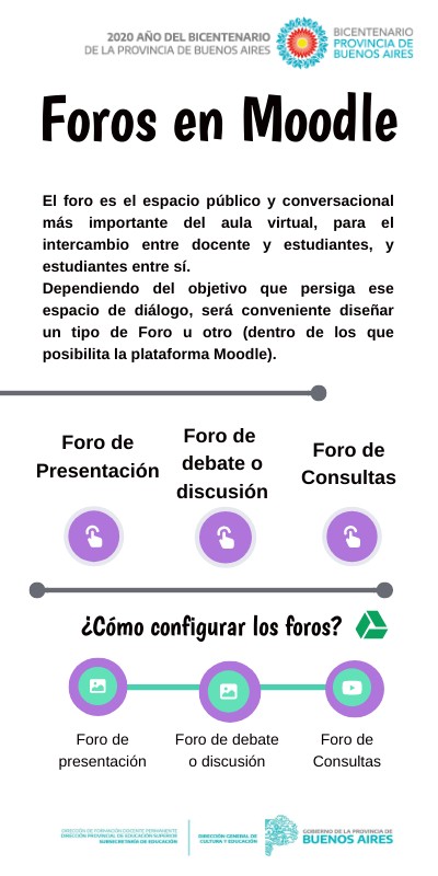 El foro es el espacio público y conversacional más importante del aula virtual, para el intercambio entre docente y estudiantes, y estudiantes entre sí. Dependiendo del objetivo que persiga ese espacio de diálogo, será conveniente diseñar un tipo de Foro u otro (dentro de los que posibilita la plataforma Moodle).