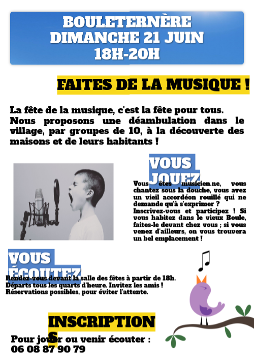 Vous êtes musicien.ne, vous chantez sous la douche, vous avez un vieil accordéon rouillé qui ne demande qu'à s'exprimer ? Inscrivez-vous et participez ! Si vous habitez dans le vieux Boule, faites-le devant chez vous ; si vous venez d'ailleurs, on vous trouvera un bel emplacement !