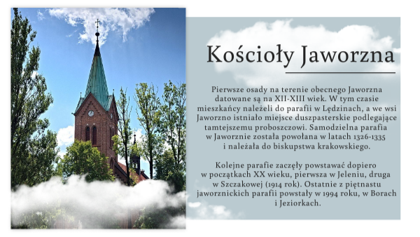 Pierwsze osady na terenie obecnego Jaworzna datowane są na XII-XIII wiek. W tym czasie mieszkańcy należeli do parafii w Lędzinach, a we wsi Jaworzno istniało miejsce duszpasterskie podlegające tamtejszemu proboszczowi. Samodzielna parafia w Jaworznie została powołana w latach 1326-1335 i należała do biskupstwa krakowskiego.Kolejne parafie zaczęły powstawać dopiero w początkach XX wieku, pierwsza w Jeleniu, druga w Szczakowej (1914 rok). Ostatnie z piętnastu jaworznickich parafii powstały w 1994 roku, w Borach i Jeziorkach.