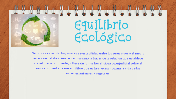 Se produce cuando hay armonía y estabilidad entre los seres vivos y el medio en el que habitan. Pero el ser humano, a través de la relación que establece con el medio ambiente, influye de forma beneficiosa o perjudicial sobre el mantenimiento de ese equilibro que es tan necesario para la vida de las especies animales y vegetales.