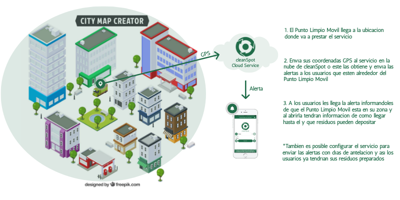 2. Envía sus coordenadas GPS al servicio en la nube de cleanSpot o este las obtiene y envía las alertas a los usuarios que estén alrededor del Punto Limpio Móvil