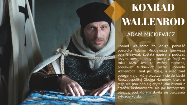 Konrad Wallenrod to druga powieść poetycka Adama Mickiewicza (pierwszą była Grażyna). Została napisana podczas przymusowego pobytu poety w Rosji w roku 1828. Jest to ważny moment, ponieważ Mickiewicz pisząc Konrada Wallenroda, znał już Rosję, a więc znał potęgę kraju, który przyczynił się do klęski Rzeczpospolitej Obojga Narodów. Utworu tego nie powinno się czytać jako historii z czasów średniowiecza, ale jak historyczny płaszcz, pod którym skryła się ówczesna sytuacja Polski.