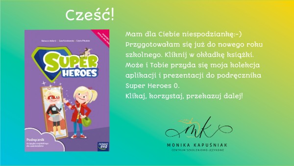Mam dla Ciebie niespodziankę:-) Przygotowałam się już do nowego roku szkolnego. Kliknij w okładkę książki. Może i Tobie przyda się moja kolekcja aplikacji i prezentacji do podręcznika Super Heroes 0. Klikaj, korzystaj, przekazuj dalej!