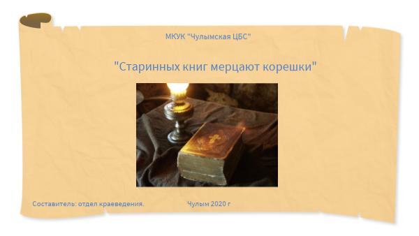 В Чулымской центральной библиотеке в отделе краеведения имеются старинные православные книги, с которыми мы хотим вас познакомить. 1. "Святое Евангелие и Псалтырь"(1900 год) 2. Изданiе Е.И. Коноваловой "В Москве" (1865 год) 3. "Немецкая библия" (1897 год)