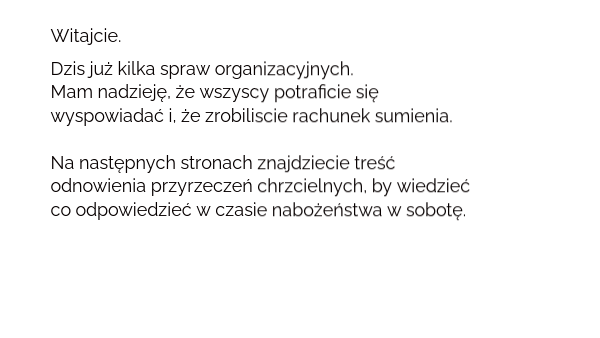 Dzis już kilka spraw organizacyjnych.Mam nadzieję, że wszyscy potraficie się wyspowiadać i, że zrobiliscie rachunek sumienia. Na następnych stronach znajdziecie treść odnowienia przyrzeczeń chrzcielnych, by wiedzieć co odpowiedzieć w czasie nabożeństwa w sobotę.