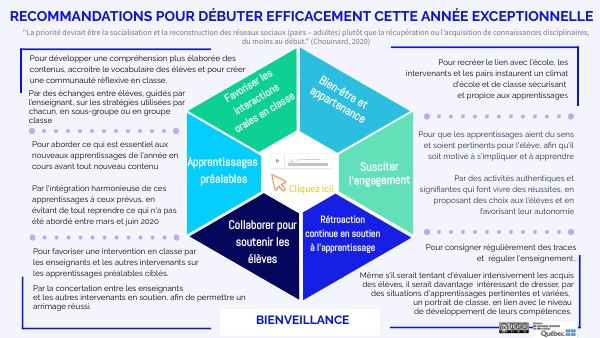 "La priorité devrait être la socialisation et la reconstruction des réseaux sociaux (pairs – adultes) plutôt que la récupération ou l’acquisition de connaissances disciplinaires, du moins au début." (Chouinard, 2020)