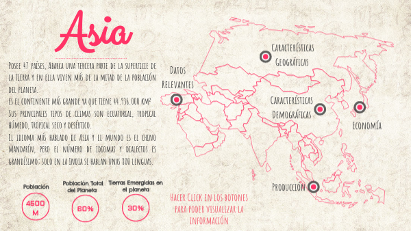 Posee 47 países, Abarca una tercera parte de la superficie de la tierra y en ella viven más de la mitad de la población del planeta. es el continente más grande ya que tiene 44.936.000 km² Sus principales tipos de climas son ecuatorial, tropical húmedo, tropical seco y desértico. El idioma más hablado de Asia y el mundo es el chino mandarín, pero el número de idiomas y dialectos es grandísimo; solo en la India se hablan unas 800 lenguas.