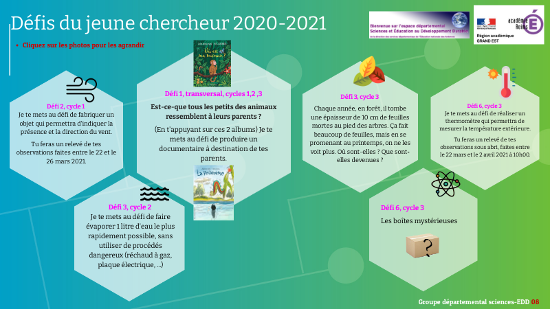 Défi 6, cycle 3 Je te mets au défi de réaliser un thermomètre qui permettra de mesurer la température extérieure. Tu feras un relevé de tes observations sous abri, faites entre le 22 mars et le 2 avril 2021 à 10h00.