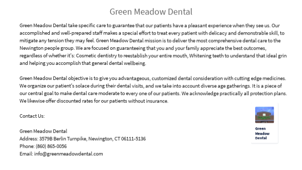 Green Meadow Dental take specific care to guarantee that our patients have a pleasant experience when they see us. Our accomplished and well-prepared staff makes a special effort to treat every patient with delicacy and demonstrable skill, to mitigate any tension they may feel. Green Meadow Dental mission is to deliver the most comprehensive dental care to the Newington people group. We are focused on guaranteeing that you and your family appreciate the best outcomes, regardless of whether it's: Cosmetic dentistry to reestablish your entire mouth, Whitening teeth to understand that ideal grin and helping you accomplish that general dental wellbeing. Green Meadow Dental objective is to give you advantageous, customized dental consideration with cutting edge medicines. We organize our patient's solace during their dental visits, and we take into account diverse age gatherings. It is a piece of our central goal to make dental care moderate to every one of our patients. We acknowledge practically all protection plans. We likewise offer discounted rates for our patients without insurance.Contact Us:Green Meadow DentalAddress: 3579B Berlin Turnpike, Newington, CT 06111-5136Phone: (860) 865-0056Email: info@greenmeadowdental.com