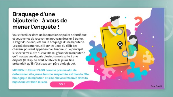 MISSION : Utilisez l'ADN comme preuve afin de déterminer si la jeune femme suspectée est bien la fille biologique du bijoutier, et si le cheveu retrouvé dans la bijouterie est bien le sien.