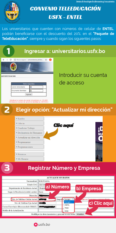 Los universitarios que cuenten con números de celular de ENTEL, podrán beneficiarse con el descuento del 20%, en el "Paquete de TeleEducación", siempre y cuando sigan los siguientes pasos: