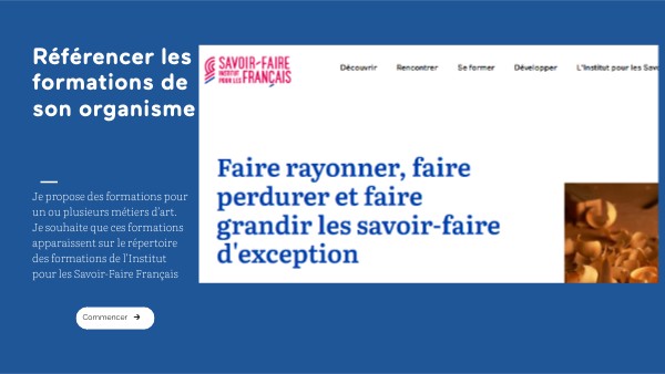 Je propose des formations pour un ou plusieurs métiers d’art. Je souhaite que ces formations apparaissent sur le répertoire des formations de l’Institut pour les Savoir-Faire Français
