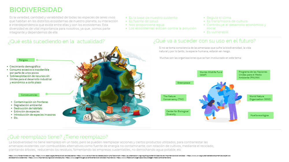 https://www.footprintnetwork.org/ - https://www.cepal.org/es/temas/biodiversidad/acerca - https://www.oei.es/historico/decada/accion.php?accion=14 - https://ayudaenaccion.org/ong/blog/sostenibilidad/claves-importancia-biodiversidad/ - https://www.un.org/sustainabledevelopment/es/objetivos-de-desarrollo-sostenible/ - https://www.importancia.org/biodiversidad.php - https://www.argentina.gob.ar/ambiente/biodiversidad/importancia - https://www.lifeder.com/organizaciones-protegen-medio-ambiente-tierra/