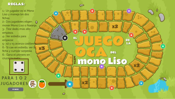 1.- Un jugador es el Mono Liso y maneja las dos fichas.2.- Dos jugadores eligen mover Mono Liso o Naranja. 3.- Tirar dado, más alto empieza. 4.- Ver estrella para empezar. 5.- x2 y x3 avanza casilleros. 6.- Si cae en estrella, ver la ficha y cumplir sorpresa. 6.- Gana el primero en cruzar la meta.