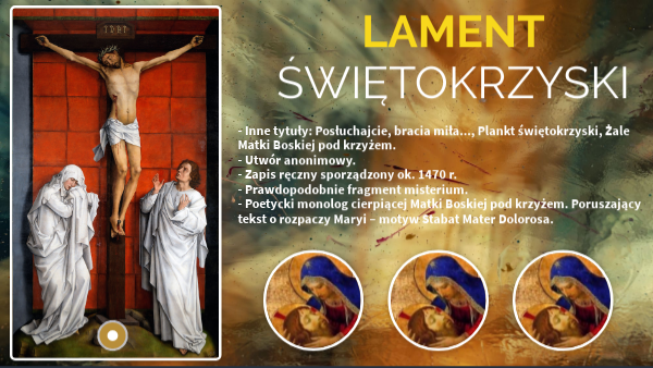 Lament świętokrzyski, znany też pod tytułem Żale Matki Boskiej pod krzyżem (Posłuchajcie, bracia miła...), uchodzi za jeden z najpiękniejszych liryków polskiego średniowiecza. Zapisał go w latach 70. XV w. przeor klasztoru Świętego Krzyża na Łysej Górze (stąd nazwa utworu). Jest to prawdopodobnie fragment zaginionego dramatu liturgicznego, przeznaczonego do wystawiania w kościołach w Wielki Piątek. Lament świętokrzyski nawiązuje do bardzo często wykorzystywanego w średniowiecznej literaturze motywu Matki Bożej, która stoi pod krzyżem i rozpacza, widząc mękę swojego syna. „Lament świętokrzyski” to utwór wierszowany napisany dość skomplikowanym językiem. Bogactwo środków stylistycznych w wierszu spowodowało, że „Lament świętokrzyski” uznano za najwybitniejsze dzieło polskiej liryki średniowiecznej. Jednak nie był to jedyny powód tak dużego poparcia dla tego utworu. Dla znawców literatury ważniejsza była postać Maryi, którą w wierszu przedstawiono jako kochającą, troskliwą i cierpiącą matkę. Nadało to wierszowi nieco innego wymiaru niż teologiczny. „Lament świętokrzyski” bardzo często porównywano z innym wierszem – „Bogurodzicą”. Utwór powstał około dwunastego wieku i podobnie jak „Lament…” został napisany przez anonimowego autora. W „Bogurodzicy” Matka Boska nie jest jednak główną i jedyną bohaterką. Podmiotem lirycznym tego wiersza są ludzie wierzący, dla których Maryja to osoba święta i należy ją prosić o łaski i wstawiennictwo u Chrystusa. Nie pokazano tam cierpienia kobiety jako matki.