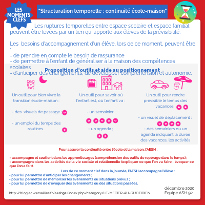 Les ruptures temporelles entre espace scolaire et espace familial peuvent être levées par un lien qui apporte aux élèves de la prévisibilité. Les besoins d'accompagnement d'un élève, lors de ce moment, peuvent être : - de prendre en compte le besoin de rassurance - de permettre à l'enfant de généraliser à la maison des compétences scolaires - d'anticiper des changements, de développer compréhension et autonomie.