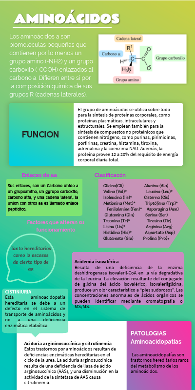 Sus enlaces, son un Carbono unido a un grupoamino, un ggrupo carboxilo, carbono alfa, y una cadena lateral, la union con otros aa es llamado enlace peptidico.