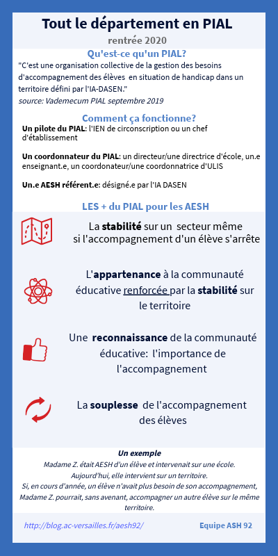 "C'est une organisation collective de la gestion des besoins d'accompagnement des élèves en situation de handicap dans un territoire défini par l'IA-DASEN."source: Vademecum PIAL septembre 2019
