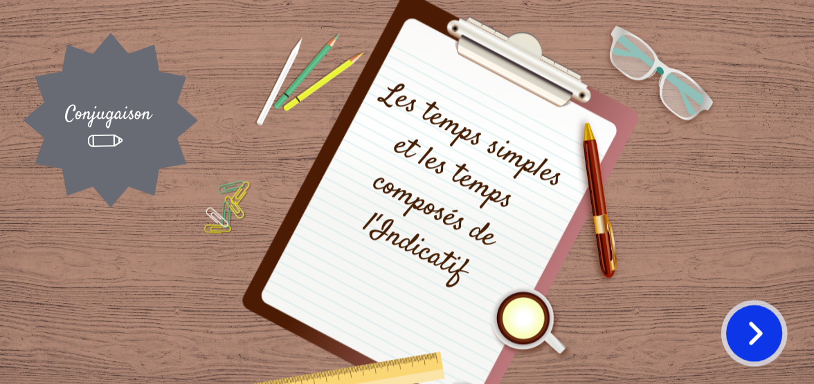 Le mode Indicatif comporte 4 temps simples auxquels correspondent 4 temps composés : Le présent Le passé composé Le futur Le futur antérieur L'imparfait Le plus-que-parfait Le passé simple Le passé antérieur