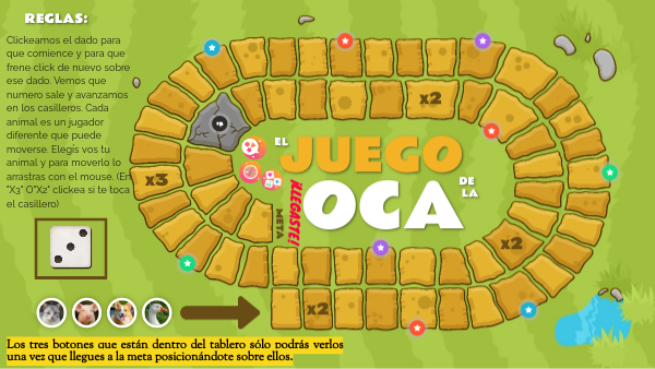 Clickeamos el dado para que comience y para que frene click de nuevo sobre ese dado. Vemos que numero sale y avanzamos en los casilleros. Cada animal es un jugador diferente que puede moverse. Elegís vos tu animal y para moverlo lo arrastras con el mouse. (En "X3" O"X2" clickea si te toca el casillero)