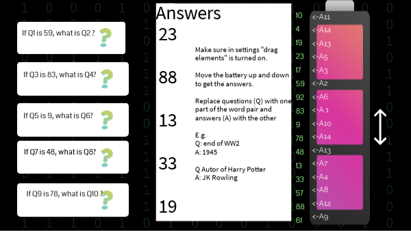 Make sure in settings "drag elements" is turned on. Move the battery up and down to get the answers. Replace questions (Q) with one part of the word pair and answers (A) with the other E.g. Q: end of WW2 A: 1945 Q Autor of Harry Potter A: JK Rowling