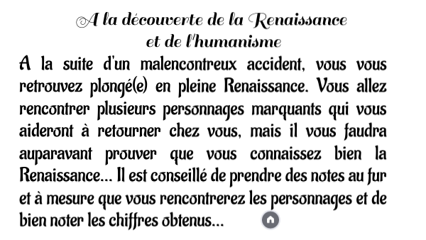 A la suite d'un malencontreux accident, vous vous retrouvez plongé(e) en pleine Renaissance. Vous allez rencontrer plusieurs personnages marquants qui vous aideront à retourner chez vous, mais il vous faudra auparavant prouver que vous connaissez bien la Renaissance... Il est conseillé de prendre des notes au fur et à mesure que vous rencontrerez les personnages et de bien noter les chiffres obtenus...
