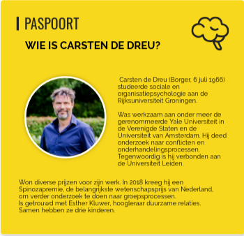 Carsten de Dreu (Borger, 6 juli 1966) studeerde sociale en organisatiepsychologie aan de Rijksuniversiteit Groningen. Was werkzaam aan onder meer de gerenommeerde Yale Universiteit in de Verenigde Staten en de Universiteit van Amsterdam. Hij deed onderzoek naar conflicten en onderhandelingsprocessen. Tegenwoordig is hij verbonden aan de Universiteit Leiden.