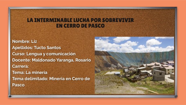 Nombre: LizApellidos: Tucto Santos Curso: Lengua y comunicación Docente: Maldonado Yaranga, Rosario Carrera: Tema: La minería Tema delimitado: Minería en Cerro de Pasco