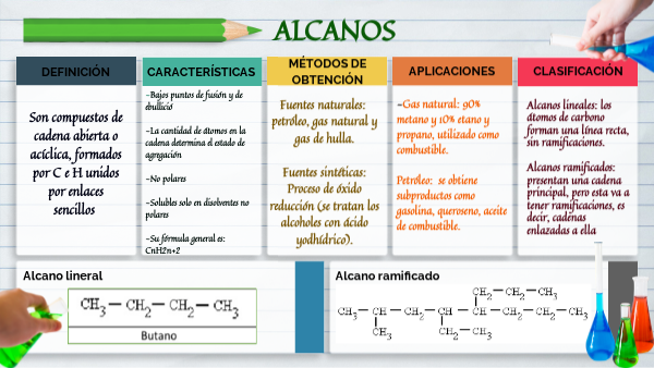 Alcanos lineales: los átomos de carbono forman una línea recta, sin ramificaciones. Alcanos ramificados: presentan una cadena principal, pero esta va a tener ramificaciones, es decir, cadenas enlazadas a ella