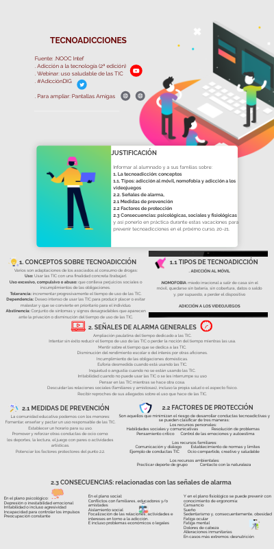 Informar al alumnado y a sus familias sobre: 1. La tecnoadicción: conceptos 1.1. Tipos: adicción al móvil, nomofobia y adicción a los videojuegos 2.2. Señales de alarma, 2.1 Medidas de prevención 2.2 Factores de protección 2.3 Consecuencias: psicológicas, sociales y fisiológicas y así ponerlo en práctica durante estas vacaciones para prevenir tecnoadicciones en el próximo curso, 20-21.