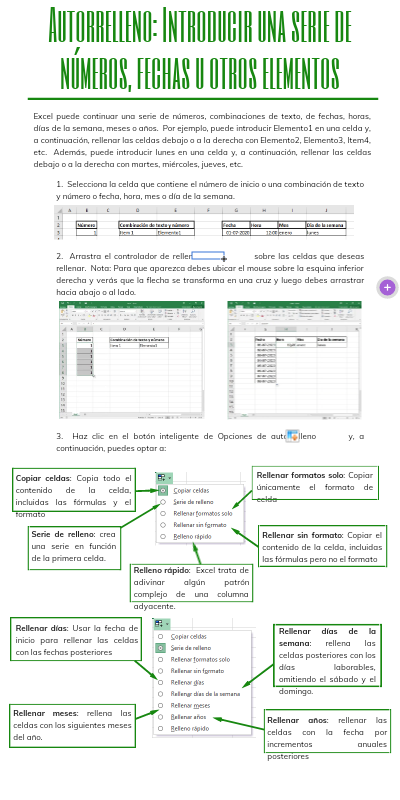 1. Selecciona la celda que contiene el número de inicio o una combinación de texto y número o fecha, hora, mes o día de la semana. 2. Arrastra el controlador de relleno sobre las celdas que deseas rellenar. Nota: Para que aparezca debes ubicar el mouse sobre la esquina inferior derecha y verás que la flecha se transforma en una cruz y luego debes arrastrar hacia abajo o al lado. 3. Haz clic en el botón inteligente de Opciones de autorrelleno y, a continuación, puedes optar a:
