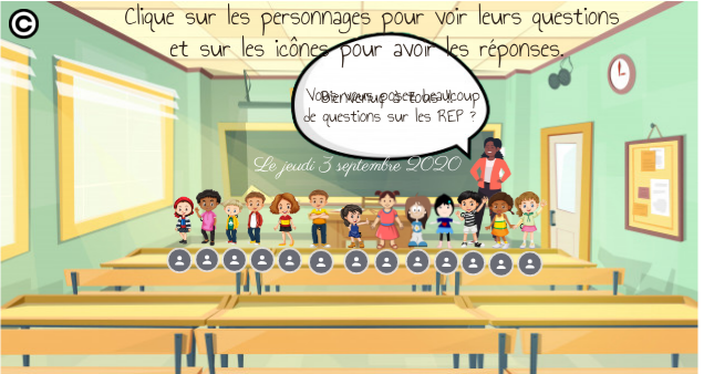 Clique sur les personnages pour voir leurs questions et sur les icônes pour avoir les réponses.