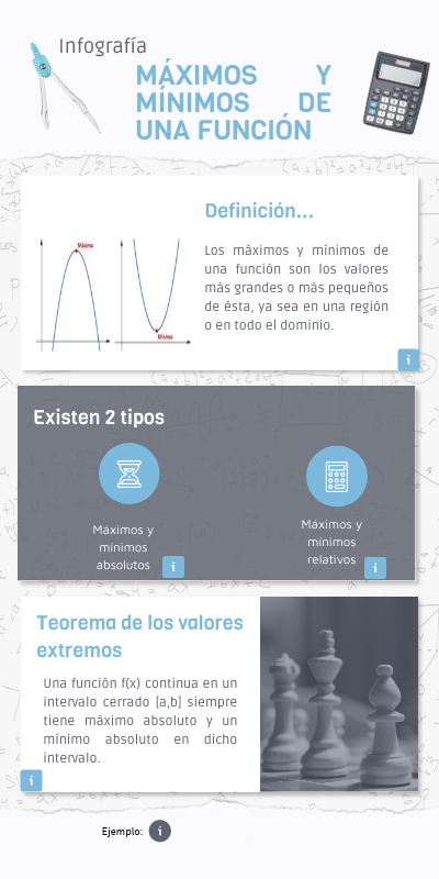 Los máximos y mínimos de una función son los valores más grandes o más pequeños de ésta, ya sea en una región o en todo el dominio.