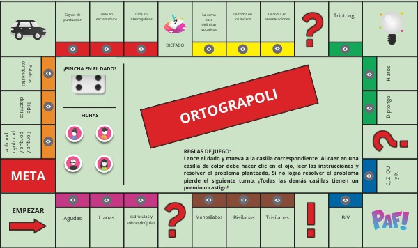 REGLAS DE JUEGO:Lance el dado y mueva a la casilla correspondiente. Al caer en una casilla de color debe hacer clic en el ojo, leer las instrucciones y resolver el problema planteado. Si no logra resolver el problema pierde el siguiente turno. ¡Todas las demás casillas tienen un premio o castigo!