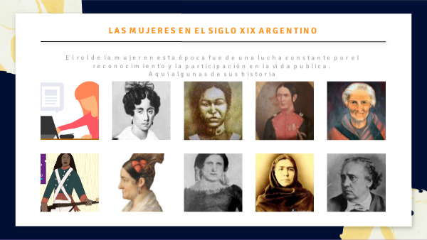 Ante la ley y el estdo, la mujer era considerada una menor de edad o discapacitada mental que no podia decidir su propio destino. A saber: administración de bienes, matrimonio, patria potestad, trabajo, educación. La vida de la mujer siempre estaba bajo la tutela de un varon familiar o esposo. El matrimonio implicaba tener una "dote" y quienes no se casaban a la pronta edad de entre 13 y 16 años, era probable que quedaran para "vestir santos" o cuidar a los familiares. El amor era secundario y los matrimonios eran arreglados. La función de la mujer era reproductiva Sin embargo, en este contexto, veremos como mujeres que pudieron acceder a la educación, se hicieron prsentes en la vida publica, o valientemente tomaron las armas para salir a pelear en las guerras por la independencia o las guerras civiles, tirando por la borda la arcaica idea de que la mujer es e "sexo debil". Les compartimos un video introductorio y dos articulos informativos sobre el tema