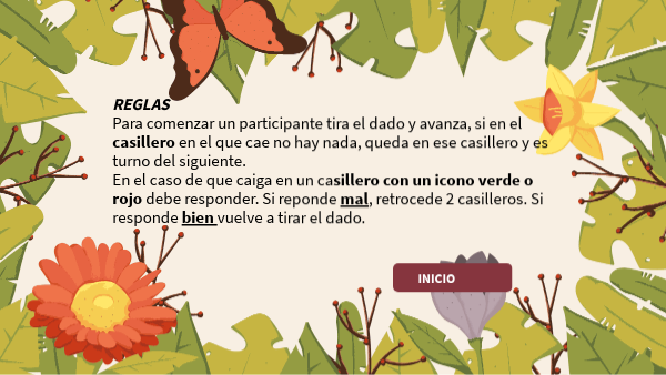 REGLAS Para comenzar un participante tira el dado y avanza, si en el casillero en el que cae no hay nada, queda en ese casillero y es turno del siguiente. En el caso de que caiga en un casillero con un icono verde o rojo debe responder. Si reponde mal, retrocede 2 casilleros. Si responde bien vuelve a tirar el dado.
