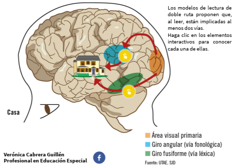 Los modelos de lectura de doble ruta proponen que, al leer, están implicadas al menos dos vías. Haga clic en los elementos interactivos para conocer cada una de ellas.