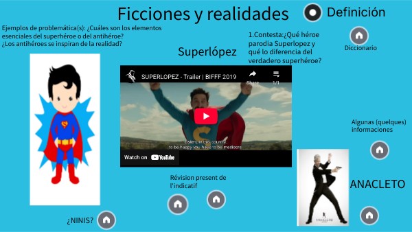En grupo presentad un super-antihéroe made in Spain: Pensad en un superhéroe y cread, a partir de éste un "super-antihéroe" para presentarlo a la clase Inventad una identidad: nombre, apellido, apodo (surnom) Pensad en sus características físicas y morales: positivos y negativos sus poderes: cuáles son, cómo los obtuvo, para qué le sirven, su motivación: explica por qué actua así; Inventad un pasado que haya marcado su personalidad su conducta Podéis hacer un montaje para animar vuestra presentación
