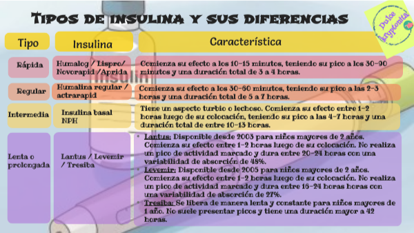 - Lantus: Disponible desde 2003 para niños mayores de 2 años. Comienza su efecto entre 1-2 horas luego de su colocación. No realiza un pico de actividad marcado y dura entre 20-24 horas con una variabilidad de absorción de 48%.