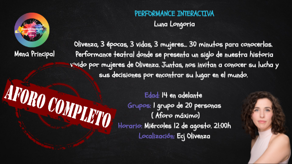 PERFORMANCE INTERACTIVA Luna Longoria Olivenza, 3 épocas, 3 vidas, 3 mujeres… 30 minutos para conocerlas. Performance teatral donde se presenta un siglo de nuestra historia vivido por mujeres de Olivenza. Juntas, nos invitan a conocer su lucha y sus decisiones por encontrar su lugar en el mundo. Edad: 14 en adelante Grupos: 1 grupo de 20 personas ( Aforo máximo) Horario: Miércoles 12 de agosto. 21:00h Localización: Ecj Olivenza