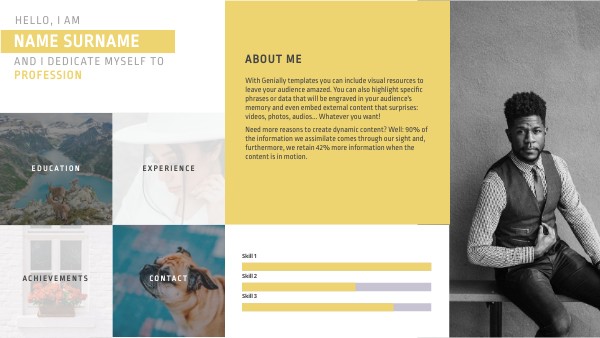 With Genially templates you can include visual resources to leave your audience amazed. You can also highlight specific phrases or data that will be engraved in your audience's memory and even embed external content that surprises: videos, photos, audios... Whatever you want! Need more reasons to create dynamic content? Well: 90% of the information we assimilate comes through our sight and, furthermore, we retain 42% more information when the content is in motion.