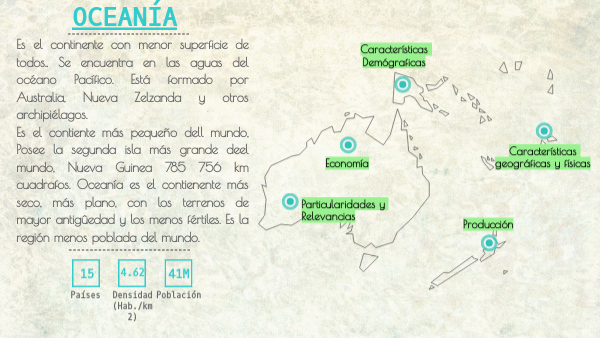 Es el continente con menor superficie de todos.. Se encuentra en las aguas del océano Pacífico. Está formado por Australia, Nueva Zelzanda y otros archipiélagos.Es el contiente más pequeño dell mundo, Posee la segunda isla más grande deel mundo, Nueva Guinea 785 756 km cuadrafos. Oceanía es el contienente más seco, más plano, con los terrenos de mayor antigûedad y los menos fértiles. Es la región menos poblada del mundo.